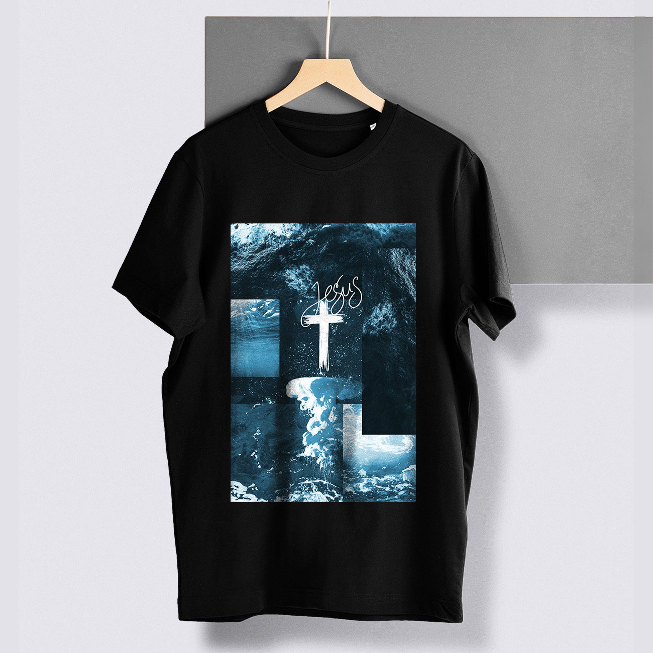 O design desta camiseta é verdadeiramente inspirador, apresentando estampas de montagens de ondas do oceano em um fundo preto, simbolizando a grandeza e a beleza da criação. No centro, uma cruz branca se destaca, acompanhada pelo nome "Jesus", reforçando uma mensagem de fé e esperança. Esta combinação de elementos não só cria uma peça visualmente atraente, mas também transmite uma mensagem profunda de conexão espiritual com o divino e a natureza.