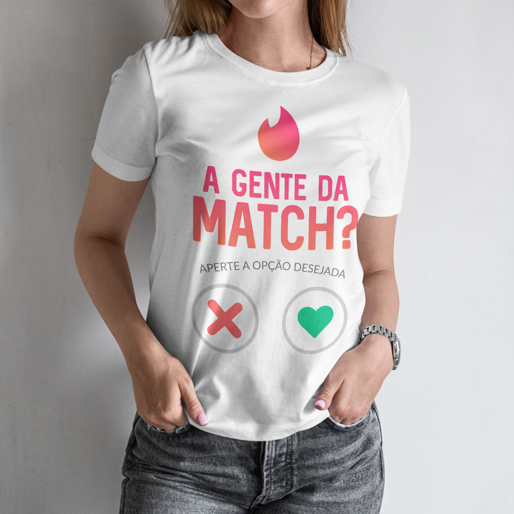 O design da camiseta é uma homenagem ao popular aplicativo de namoro Tinder, apresentando de forma criativa a logo do app, acompanhada da pergunta "A gente dá match?". O toque especial fica por conta dos dois botões interativos na camiseta: um com o símbolo de "cancelado" e outro com o de "match". Esses botões não apenas adicionam um elemento divertido à peça, mas também convidam para uma interação lúdica entre as pessoas durante as festas de Carnaval.