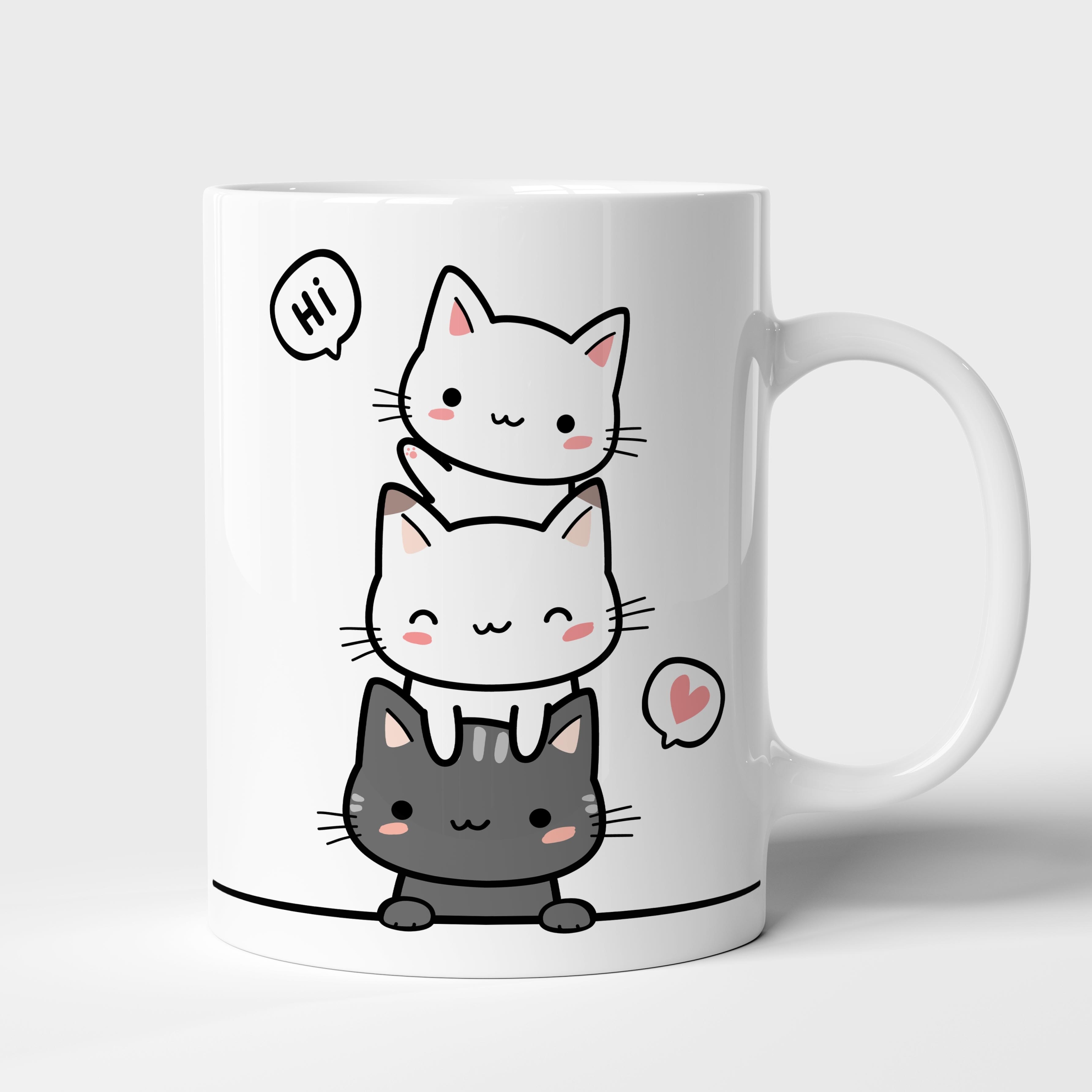 Desperte cada manhã com um sorriso com a nossa Caneca de Cerâmica "Gatinhos Empilhados". Esta caneca adorável apresenta um desenho encantador de três gatinhos fofos, um em cima do outro, acenando um alegre "Hi". Ideal para os amantes de gatos e para todos que apreciam um toque de alegria e ternura em suas rotinas matinais.