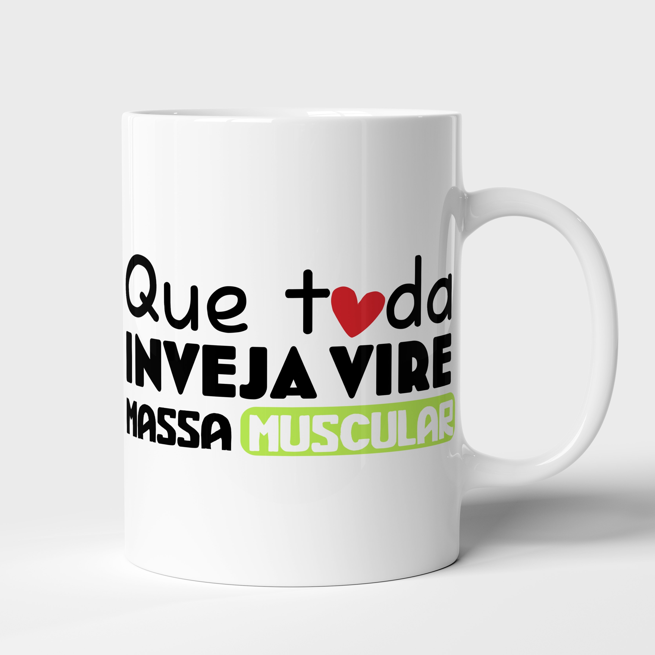 - Frase Motivacional: Estampada com a frase “Que Toda Inveja Vire Massa Muscular”, a caneca serve como um lembrete diário para transformar a negatividade em força e determinação.
